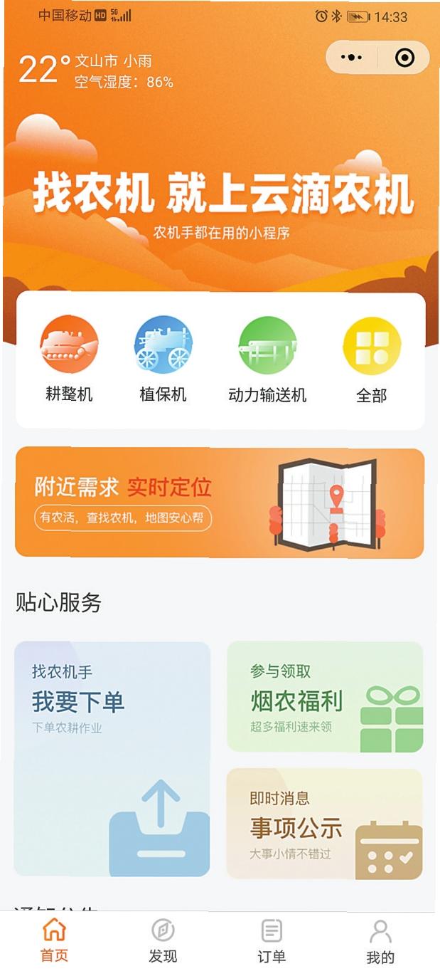 “云滴農(nóng)機(jī)”和“空中滇農(nóng)”是文山州局(公司)聯(lián)合北京航空航天大學(xué)云南創(chuàng)新研究院研發(fā)推廣的農(nóng)機(jī)機(jī)耕服務(wù)以及無(wú)人機(jī)植保服務(wù)微信小程序,通過(guò)移動(dòng)互聯(lián)網(wǎng)技術(shù)搭建起了煙農(nóng)與機(jī)耕手及無(wú)人機(jī)飛手的橋梁。