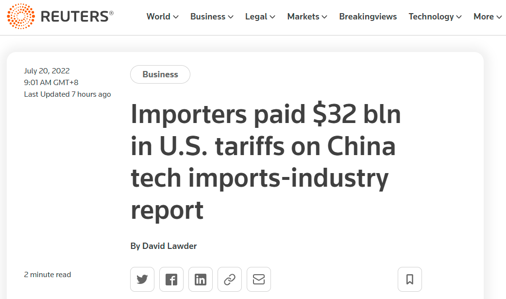 路透社7月20日?qǐng)?bào)道稱,美國(guó)消費(fèi)者技術(shù)協(xié)會(huì)(CTA)周二發(fā)布的報(bào)告顯示,受到前任總統(tǒng)特朗普對(duì)華加征關(guān)稅措施影響,從2018年年中到2021年年底,美國(guó)企業(yè)為進(jìn)口中國(guó)科技產(chǎn)品支付了逾320億美元關(guān)稅。