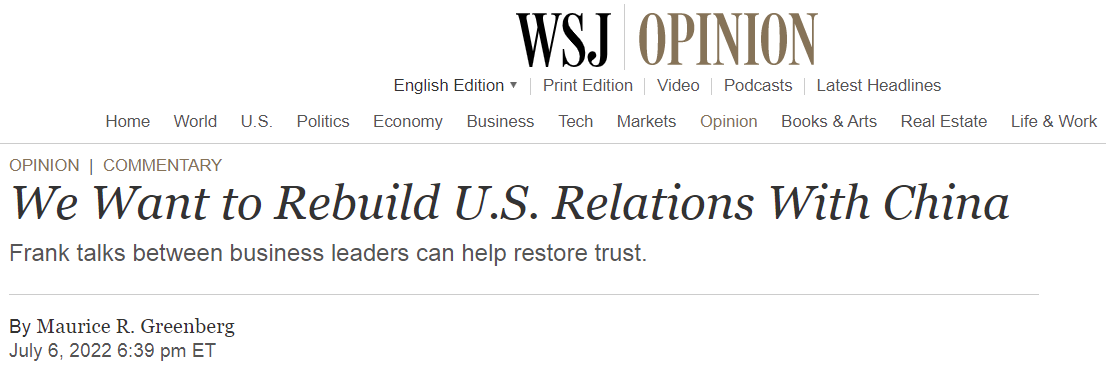 近日,史帶集團(tuán)首席執(zhí)行官、美中關(guān)系全國(guó)委員會(huì)執(zhí)行副主席莫里斯?格林伯格在《華爾街日?qǐng)?bào)》刊發(fā)題為《我們希望重塑對(duì)華關(guān)系》的文章稱,美中關(guān)系是世界上最重要的雙邊關(guān)系。美中兩國(guó)企業(yè)在對(duì)方國(guó)家開(kāi)設(shè)的業(yè)務(wù)遍及各行各業(yè),兩國(guó)貿(mào)易總額每年高達(dá)數(shù)千億美元,為兩國(guó)帶來(lái)巨大利益。