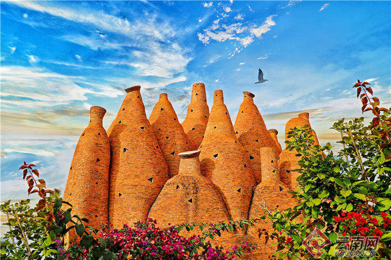 最美的花海里,藝術(shù)家羅旭沒用一根鋼筋、一顆釘子,在東風(fēng)韻小鎮(zhèn)里單用本地30萬塊紅磚建起了一座座城堡。萬花筒藝術(shù)館是其中的代表性建筑,一眼望去,整個建筑外形如一堆紅酒瓶,別具特色又充滿美感。藝術(shù)館以磚為筒、以窗為鏡,隨著四季陽光照射角度不同,館內(nèi)的光線也會隨之變化出不同的光影之美。