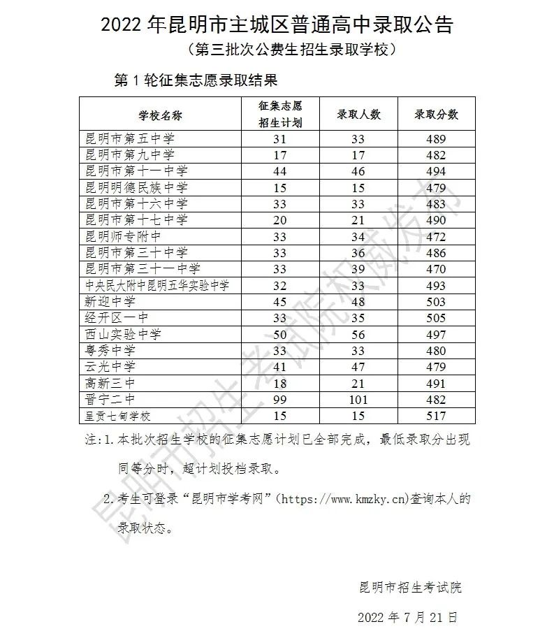 昆明信息港訊 記者上官艷君 7月21日,昆明市招生考試院發(fā)布2022年昆明市主城區(qū)普通高中錄取公告(第三批次公費(fèi)生招生錄取學(xué)校)第1輪征集志愿錄取結(jié)果。