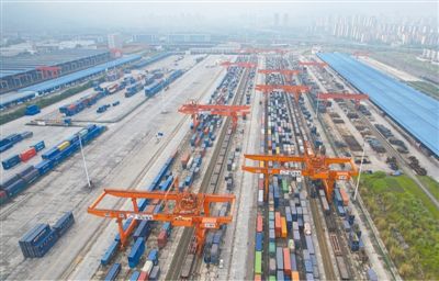 4月2日,重慶團結(jié)村中心站,站內(nèi)正在進行裝卸集裝箱作業(yè)。