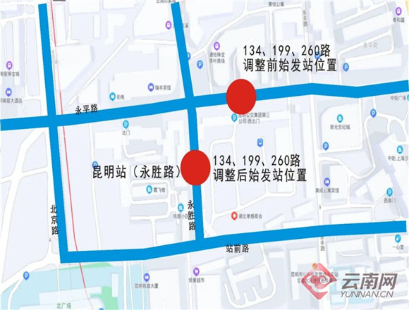 調(diào)整前,134路、199路、260路等三條公交線路在昆明站的始發(fā)站位于永平路,該位置為臨時(shí)上下客停車點(diǎn)。