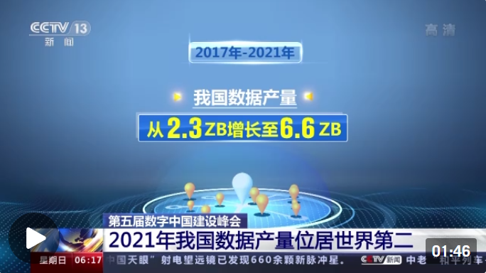 《數(shù)字中國發(fā)展報(bào)告(2021年)》指出,2017年到2021年,我國數(shù)據(jù)產(chǎn)量從2.3ZB增長至6.6ZB,而1ZB數(shù)據(jù),就相當(dāng)于500萬億張自拍照、2.5 萬億首MP3歌曲。這一數(shù)據(jù)產(chǎn)量在2021年全球占比9.9%,位居世界第二。我國已建成全球規(guī)模最大、技術(shù)領(lǐng)先的網(wǎng)絡(luò)基礎(chǔ)設(shè)施。截至2021年底,我國已建成142.5萬個(gè)5G基站,總量占全球60%以上,5G用戶數(shù)達(dá)到3.55億戶,行政村、脫貧村通寬帶率達(dá)100%。目前,我國工業(yè)互聯(lián)網(wǎng)應(yīng)用已覆蓋45個(gè)國民經(jīng)濟(jì)大類,電子商務(wù)交易額從2017年的29萬億元增長至2021年的42萬億元。