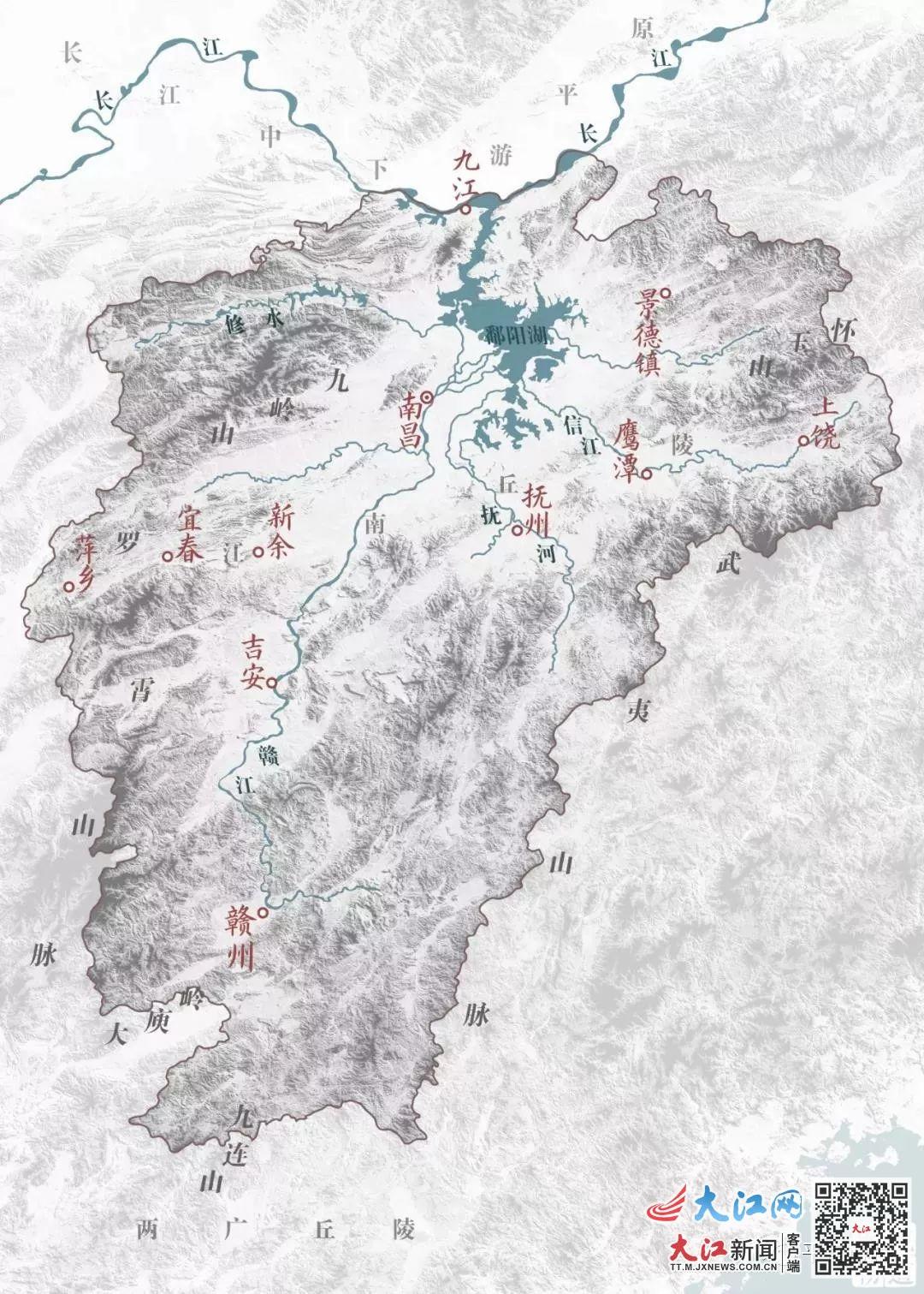 首先來看江西的山和江。江西地形是南北長,東西短,三面環(huán)山,一面朝水。