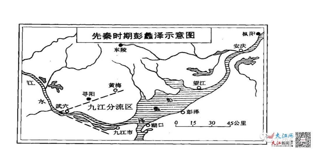冰期過后,氣候變暖,海平面慢慢上升,對長江的水產(chǎn)生頂托,長江河床的溯流侵蝕停止,長江和鄱陽湖盆的高差逐漸減少。距今6300年屬于全新紀(jì)最溫暖時期,雨量充沛。古長江出了武穴后,就分散為眾多的游蕩型中小河流,北至黃梅城關(guān)、南至現(xiàn)今九江市形成一個巨大的扇形三角洲,尚未形成主泓道,呈現(xiàn)沼澤地貌。后來人稱彭蠡古澤。九江就跟這里有關(guān),毛主席詞“云橫九派浮黃鶴,浪下三吳起白煙”中的“九派”就指這一帶形成的彭蠡古澤。請看彭蠡古澤圖(譚其驤、張修桂,1982):