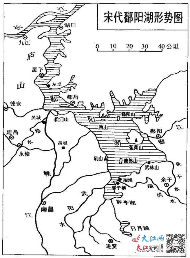 江西北邊的幕阜山和九嶺山下來的水叫修河,彎彎曲曲地流到永修縣,從吳城注入鄱陽湖。