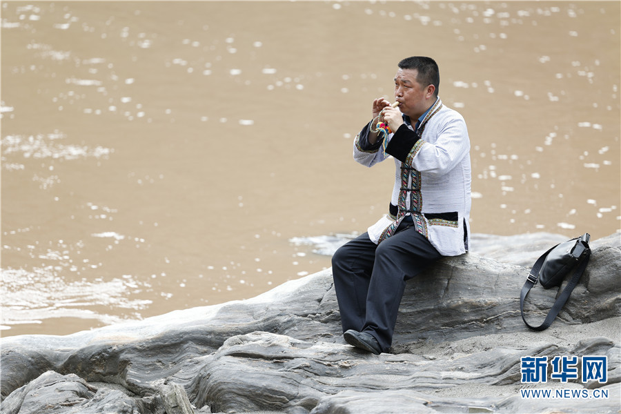 馬金華在怒江邊吹奏傈僳族樂器笛哩圖。新華網(wǎng) 李浩 攝