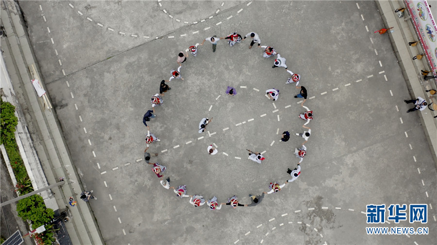 航拍福貢縣臘竹底村村民排練傈僳族舞蹈。新華網(wǎng) 李浩 攝