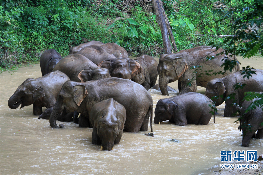象群在水中玩耍(資料圖)。新華網(wǎng)發(fā)(沈慶仲 攝)