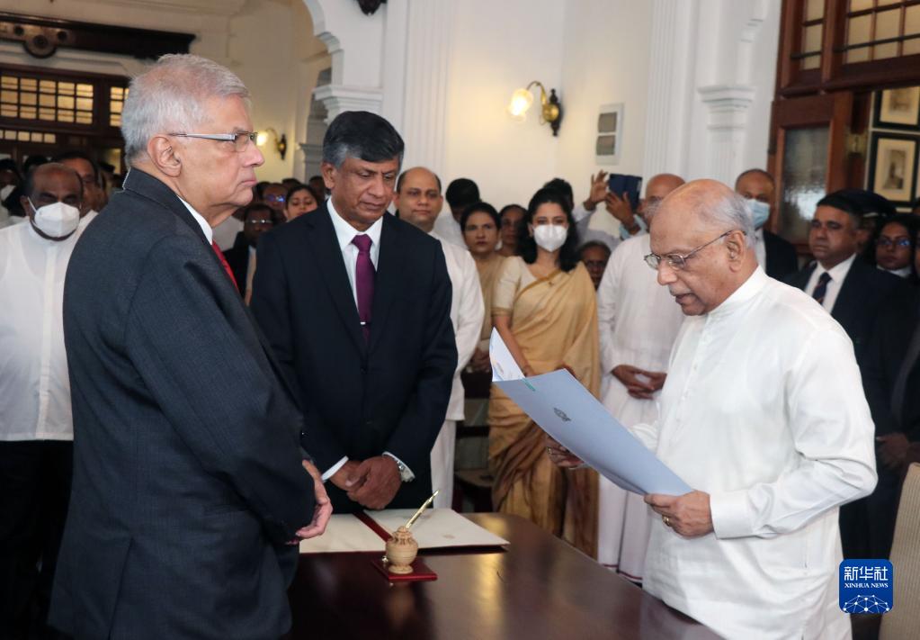 7月22日,斯里蘭卡新總理古納瓦德納(前右)在科倫坡宣誓就職。新華社發(fā)(阿吉特·佩雷拉攝)