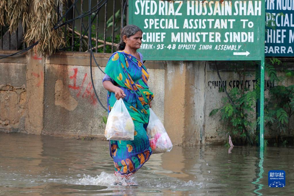 7月25日,一名女子涉水經(jīng)過(guò)巴基斯坦卡拉奇一條被積水淹沒(méi)的道路。