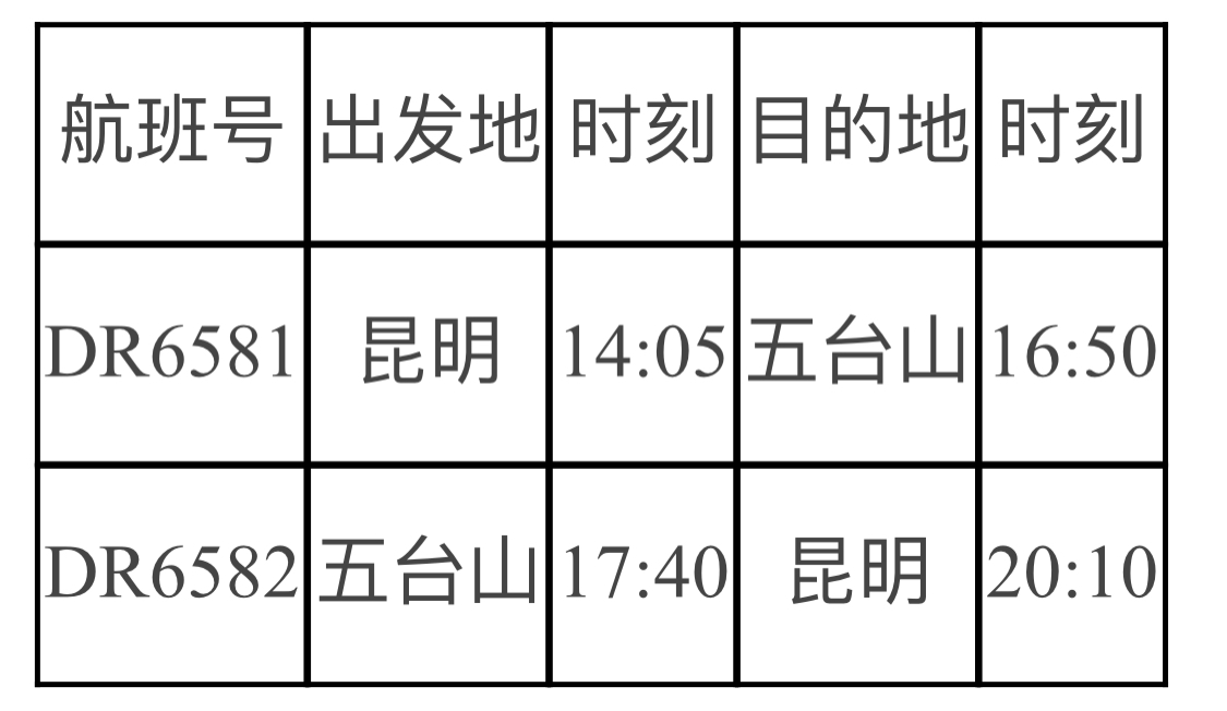 “昆明=五臺(tái)山”航班班期計(jì)劃為每周二、四、六執(zhí)飛,航班信息如下: