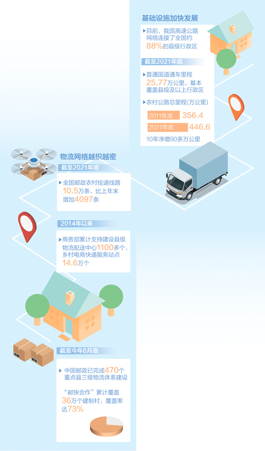 近年來,我國“通道+樞紐+網(wǎng)絡”物流運行體系建設持續(xù)推進,重大物流基礎設施加快建設,國家骨干流通網(wǎng)絡逐步健全。日前發(fā)布的《2021年郵政行業(yè)發(fā)展統(tǒng)計公報》指出,全國郵政農村投遞線路10.5萬條,比上年末增加4097條;農村投遞路線長度(單程)415.5萬公里,比上年末增加5.1萬公里。