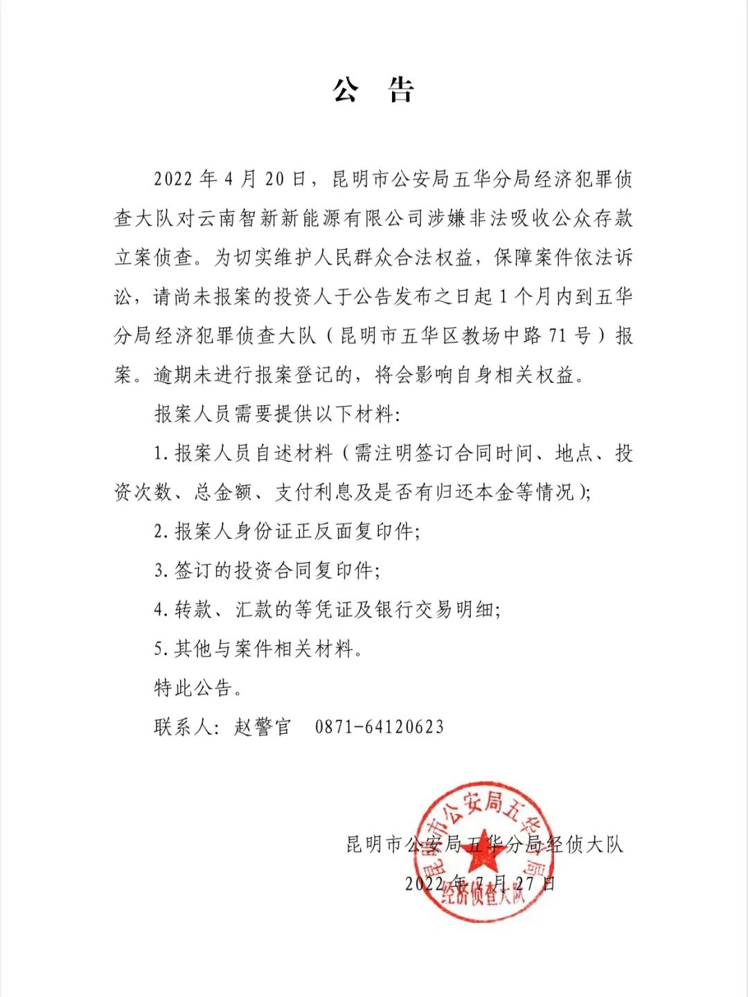 昆明市公安局五華分局經(jīng)偵大隊(duì)發(fā)布一則《公告》稱
