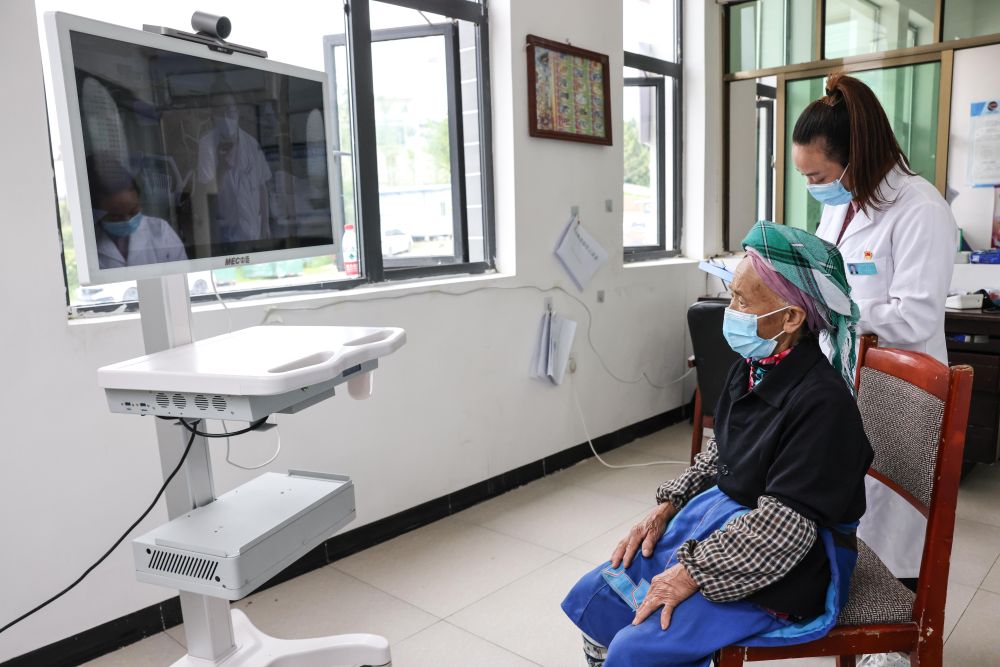 6月7日,在貴州省龍里縣龍山鎮(zhèn)團結村衛(wèi)生室,村醫(yī)陳莉(右)協(xié)助村民陳志珍通過遠程診斷系統(tǒng)問診。新華社記者 歐東衢 攝