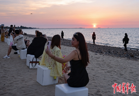 7月28日,海南??冢诙弥袊鴩H消費(fèi)品博覽會(huì)時(shí)裝周上,海邊秀場(chǎng)的觀眾以時(shí)裝秀為背景拍照留念。時(shí)裝周是本屆博覽會(huì)的重要活動(dòng)之一,今年設(shè)置了室內(nèi)和海邊雙秀場(chǎng),參展的大多數(shù)是女裝品牌。