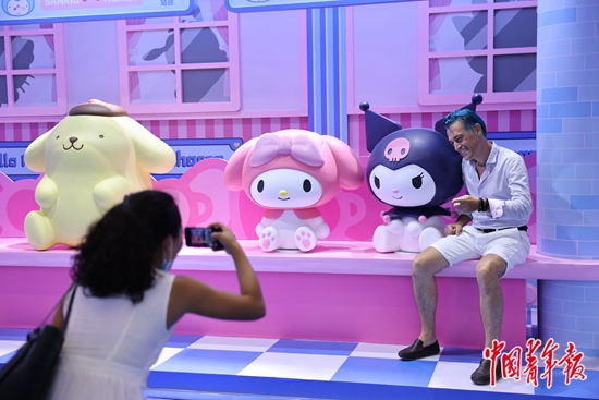 7月25日,海南海口,第二屆中國國際消費(fèi)品博覽會(huì)服務(wù)消費(fèi)展區(qū)內(nèi),外國參觀者與三麗鷗展位的卡通形象展品合影。許多人認(rèn)為,女性消費(fèi)能力提升是卡通形象IP流行的原因之一。