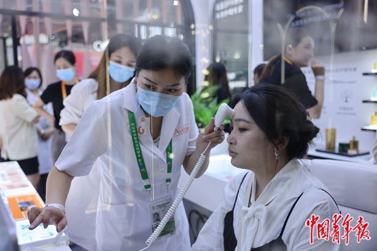 7月26日,海南海口,第二屆中國國際消費(fèi)品博覽會(huì)法國館一家護(hù)膚品品牌展位上,關(guān)注科技美膚的女性參觀者排隊(duì)體驗(yàn)AI智能測(cè)膚儀。這款測(cè)膚儀可實(shí)時(shí)顯示放大30倍的毛孔并發(fā)送檢測(cè)報(bào)告。