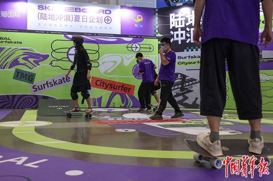 7月26日,海南???,第二屆中國國際消費(fèi)品博覽會(huì)上,一家參展商在進(jìn)行陸地沖浪教學(xué)活動(dòng)。陸地沖浪是當(dāng)下十分受年輕人喜愛的一種運(yùn)動(dòng),尤其在疫情背景下,年輕人紛紛擁抱戶外運(yùn)動(dòng),陸地沖浪不僅是一種鍛煉,更具備社交功能。