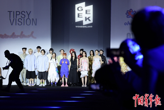 7月27日,海南海口,第二屆中國國際消費(fèi)品博覽會(huì)時(shí)裝周上,4個(gè)年輕品牌的設(shè)計(jì)師與模特在走秀結(jié)束后合影,他們中不乏00后。