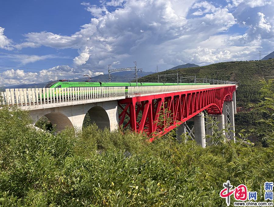 7月27日,一列動車駛過中老鐵路元江特大橋。中國網(wǎng)記者 唐佳蕾 攝