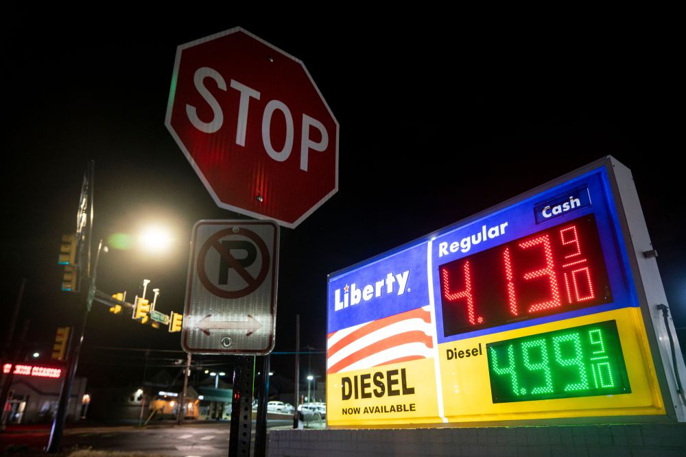 這是3月31日在美國(guó)弗吉尼亞州阿靈頓拍攝的一處加油站的油價(jià)顯示牌。(新華社記者劉杰攝)