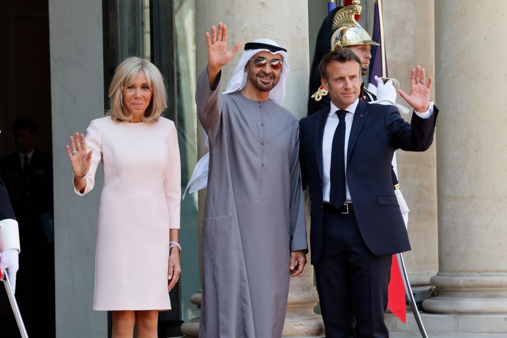 7月18日,法國(guó)總統(tǒng)馬克龍(右)和夫人布麗吉特在巴黎總統(tǒng)府愛(ài)麗舍宮迎接到訪(fǎng)的阿拉伯聯(lián)合酋長(zhǎng)國(guó)總統(tǒng)穆罕默德(中)。(新華社發(fā),里特·艾斯攝)