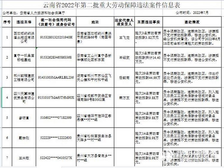 昆明信息港訊 記者江楓 近日,云南省人力資源和社會保障廳公布了今年第二批重大勞動保障違法案件,共7件,涉及4個用人單位和3個自然人。