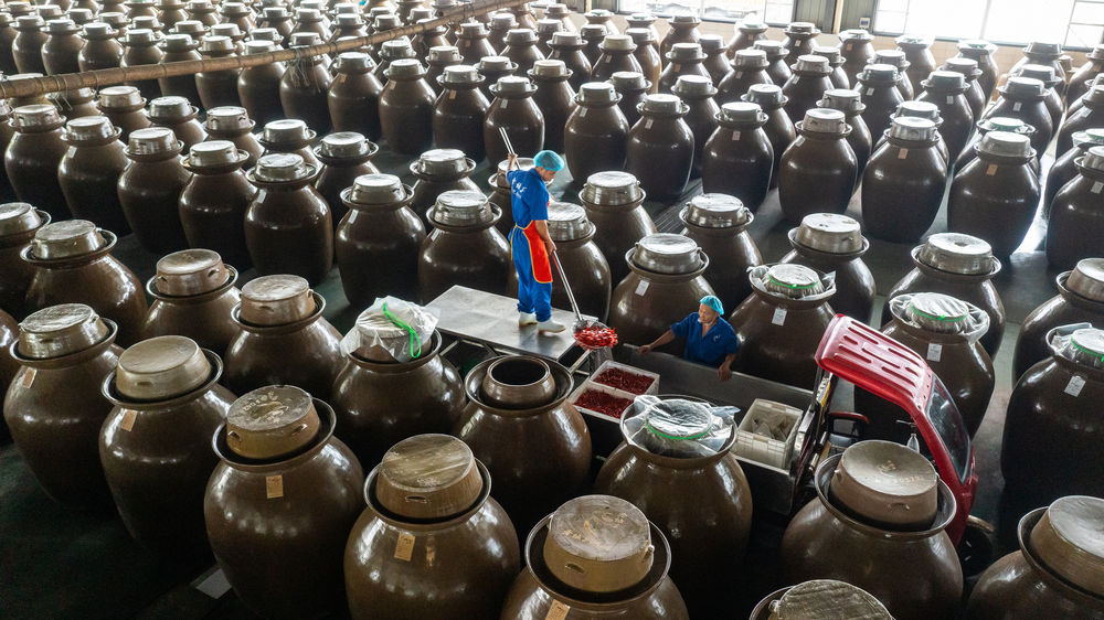 位于四川省眉山市的四川老壇子食品有限公司的工人在撈取已經(jīng)腌制好的泡菜(2022年6月24日攝,無(wú)人機(jī)照片)。新華社記者 沈伯韓 攝