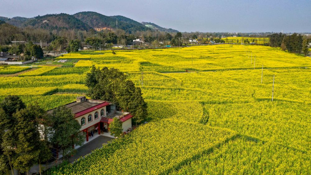 在四川成都崇州市拍攝的油菜花田(2020年2月25日攝,無(wú)人機(jī)照片)。新華社記者 王曦 攝