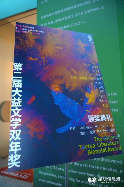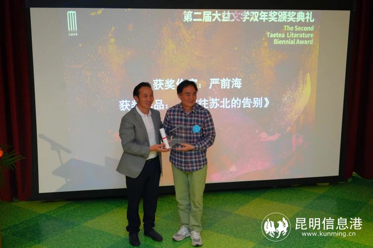 昆明信息港訊 記者陳秋月 8月1日,第二屆"大益文學(xué)雙年獎"頒獎典禮在昆明璞玉書店舉辦。由著名作家馬原,著名評論家陳曉明,著名出版人彭倫、曹元勇,大益文學(xué)院院長陳鵬5位終審評委從大益文學(xué)書系13輯——20輯(兩年,8輯)的十位入圍作家中最終評選出一位獲獎作家。最終,嚴前海憑借《前往蘇北的告別》從十位入圍作家中脫穎而出,獲得第二屆"大益文學(xué)雙年獎"。