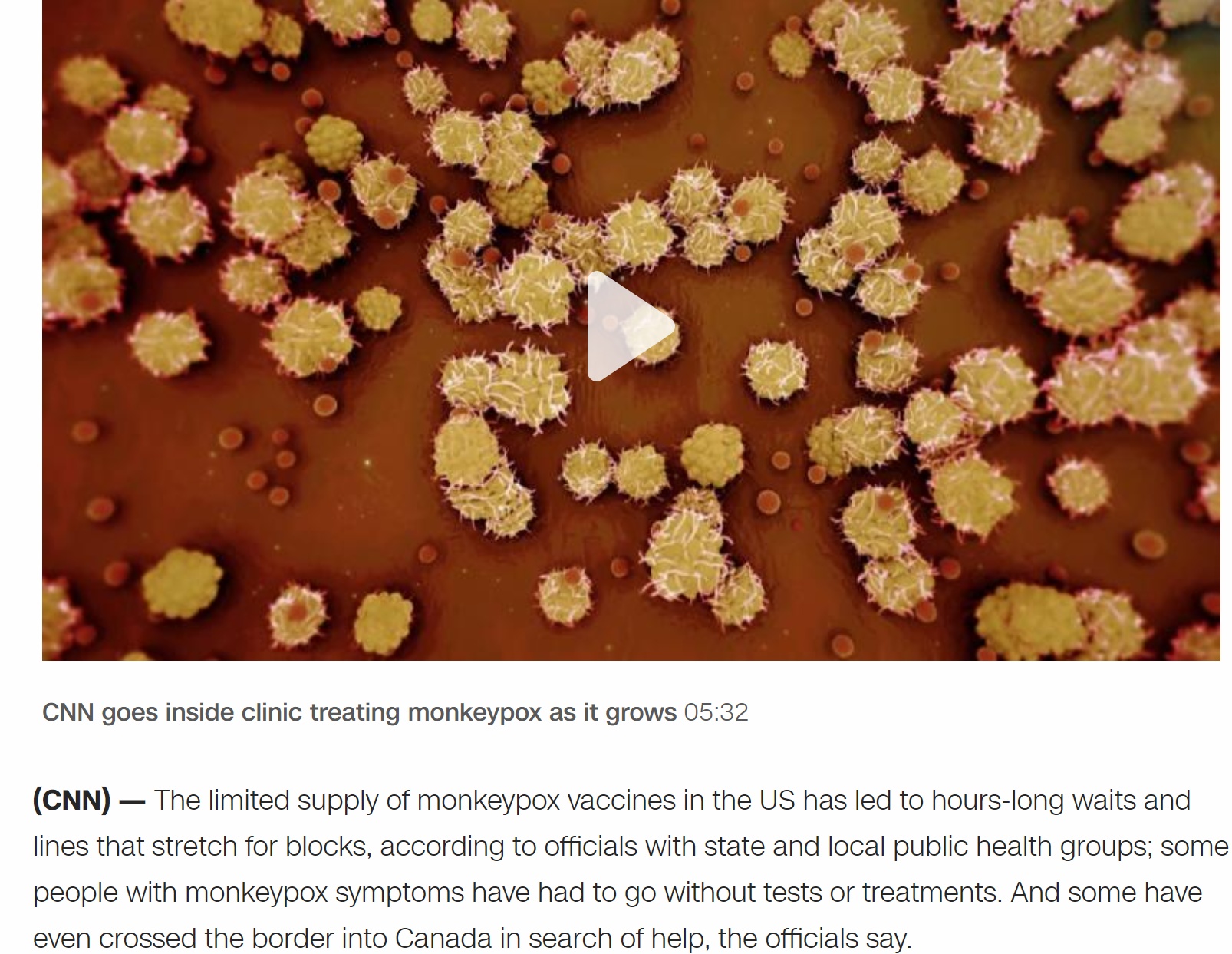 據(jù)美國有線電視新聞網(wǎng)報(bào)道,一些出現(xiàn)猴痘癥狀、疑似感染猴痘的民眾無處做檢測、無處治療,感到自己“被政府拋棄了”。其中一些人不得不赴加拿大尋求醫(yī)治。