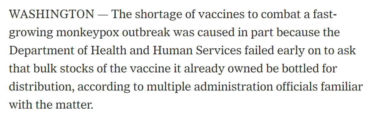 《紐約時報(bào)》:多名官員披露,美國衛(wèi)生與公共服務(wù)部未曾要求制藥商將政府儲備的猴痘疫苗分裝成小瓶,導(dǎo)致美國當(dāng)前猴痘疫苗供應(yīng)不足。一名前疾病控制與預(yù)防中心顧問批評聯(lián)邦政府對猴痘疫情的應(yīng)對與新冠肺炎疫情的前期表現(xiàn)一樣糟糕:充斥著官僚作風(fēng)導(dǎo)致的延誤與不當(dāng)回事,并且推卸責(zé)任。
