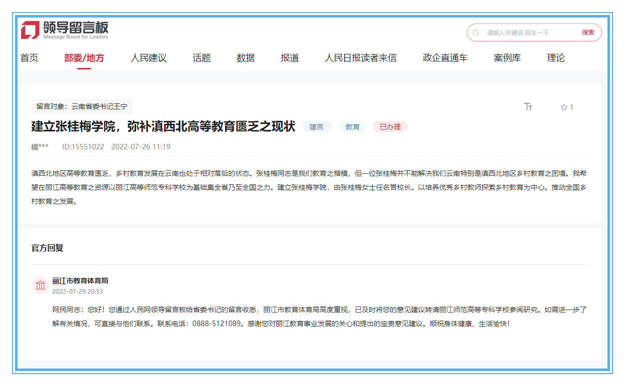 該網(wǎng)友表示,滇西北地區(qū)高等教育匱乏,鄉(xiāng)村教育發(fā)展在云南也處于相對落后的狀態(tài),希望建立張桂梅學(xué)院,以培養(yǎng)優(yōu)秀鄉(xiāng)村教師探索鄉(xiāng)村教育為中心,推動全國鄉(xiāng)村教育之發(fā)展。麗江市教育體育局在回復(fù)中表示,麗江市教育體育局高度重視,已及時(shí)將網(wǎng)友的意見建議轉(zhuǎn)請麗江師范高等??茖W(xué)校參閱研究。