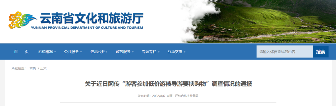 8月6日,云南省文化和旅游廳綜合執(zhí)法監(jiān)督局就網(wǎng)傳“游客參加低價(jià)游被導(dǎo)游要挾購物”調(diào)查情況發(fā)布通報(bào)。