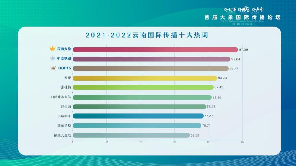 2021——2022年度,“云南大象”“中老鐵路”“COP15”“云花”“張桂梅”“白鶴灘水電站”“野生菌”“小??Х取薄叭瘥惪挂摺薄昂蟊l(fā)”十個熱詞成為最能夠代表云南省國際傳播印象的詞匯。