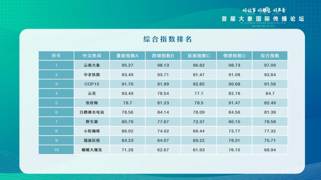 其中,云南大象、中老鐵路、COP15綜合指數(shù)排名位居“熱詞”榜單前三。