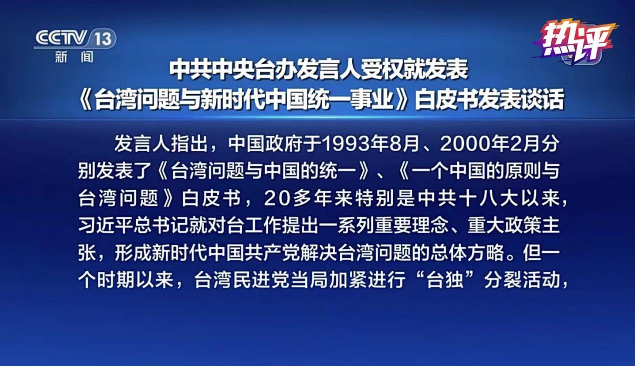 “臺灣是中國的一部分不容置疑也不容改變”“中國共產(chǎn)黨堅(jiān)定不移推進(jìn)祖國完全統(tǒng)一”“外部勢力阻礙中國完全統(tǒng)一必遭失敗”……國務(wù)院臺灣事務(wù)辦公室、國務(wù)院新聞辦公室10日發(fā)表《臺灣問題與新時(shí)代中國統(tǒng)一事業(yè)》白皮書,那些鏗鏘有力的表述,展示了我們在新時(shí)代新征程上推進(jìn)祖國統(tǒng)一、實(shí)現(xiàn)和平統(tǒng)一光明前景的堅(jiān)定意志、堅(jiān)強(qiáng)決心和強(qiáng)大能力。