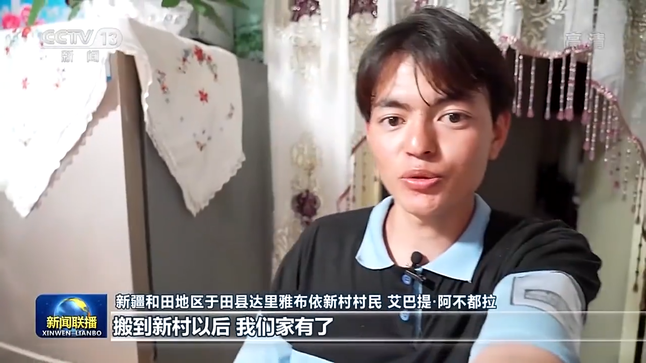 新疆和田地區(qū)于田縣達(dá)里雅布依新村村民 艾巴提·阿不都拉:搬到新村以后,我們家有了冰箱、電視機(jī)、茶幾、沙發(fā)等家電家具,我們一家人很開心,很幸福。