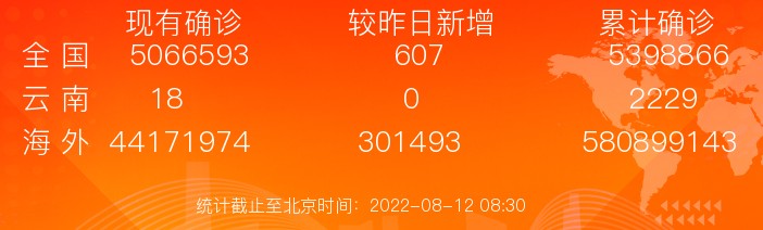 截至2022年8月11日24時,全省現(xiàn)有確診病例18例,累計治愈出院病例2210例,累計死亡病例2例,累計報告確診病例2230例。累計追蹤到密切接觸者85779人,尚在醫(yī)學(xué)觀察的密切接觸者1046人。