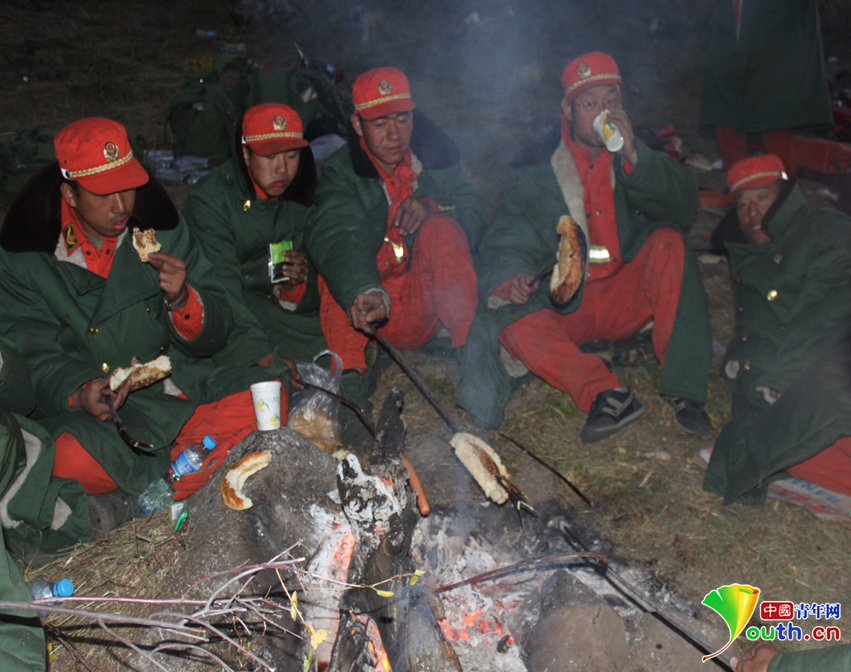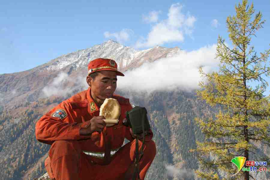 2011年9月13日新疆禾木大火,白立成和“戰(zhàn)友們”連續(xù)作戰(zhàn)28天才最終撲滅火災(zāi)。圖為滅火作戰(zhàn)的第17天,白立成正在補充給養(yǎng)。白立成供圖