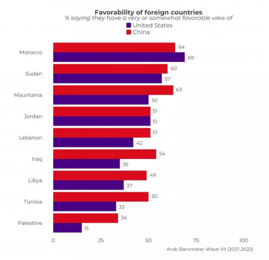 這項民調(diào)顯示,在這9個國家中,只有在對中美兩國的好感度均為最高的摩洛哥,民眾對美國(69%)的好感度略高于中國(64%)。約旦對兩國好感度都為51%。其他7個國家對中國的好感度都超過美國。蘇丹對中美兩國的好感度分別為60%和57%,中國領(lǐng)先3個百分點;中國在黎巴嫩的好感度為51%,美國(42%)落后中國9個百分點。在其他幾個國家,中國優(yōu)勢更為明顯:美國在利比亞的好感度為37%,落后中國(49%)12個百分點;毛里塔尼亞對中美兩國的好感度分別為63%和50%;突尼斯的該數(shù)字分別為50%和33%,在伊拉克分別為54%和35%,在巴勒斯坦分別為34%和15%。