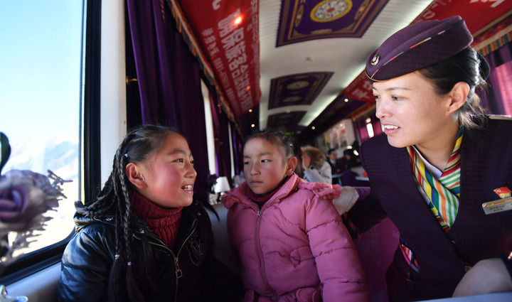 青藏鐵路拉薩至日喀則段的藏族女列車(chē)長(zhǎng)貢久曲珍(右)與乘客聊天(2020年1月12日攝)。 新華社記者 覺(jué)果 攝