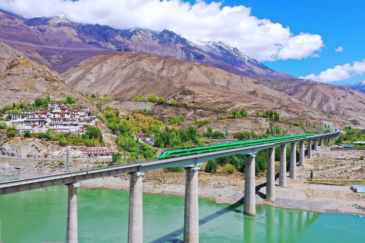 復(fù)興號(hào)列車(chē)行駛在西藏朗縣境內(nèi)(2022年4月14日攝)。 新華社記者 覺(jué)果 攝