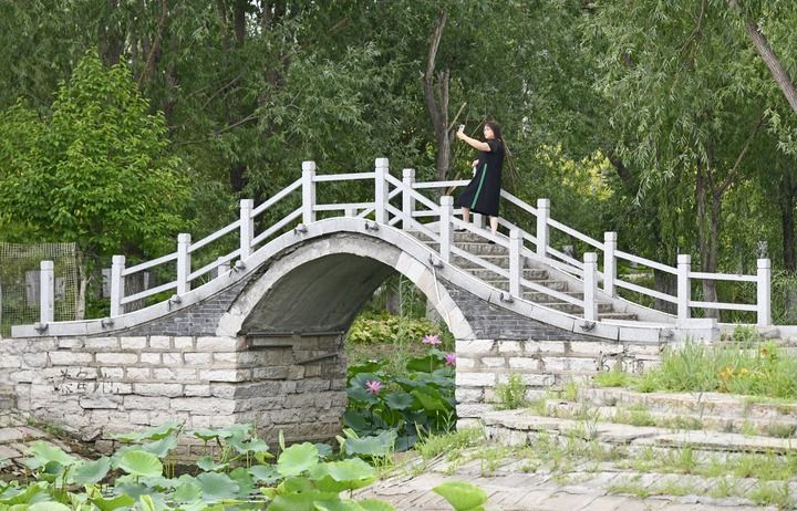 一名游客在天津市寶坻區(qū)黃莊鎮(zhèn)小辛碼頭村里的小橋上拍照留念(6月29日攝)。