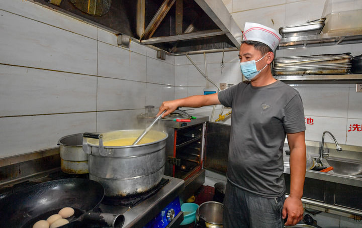 在天津市寶坻區(qū)黃莊鎮(zhèn)小辛碼頭村,李超為客人準(zhǔn)備早餐(2021年9月3日攝)。新華社記者孫凡越攝