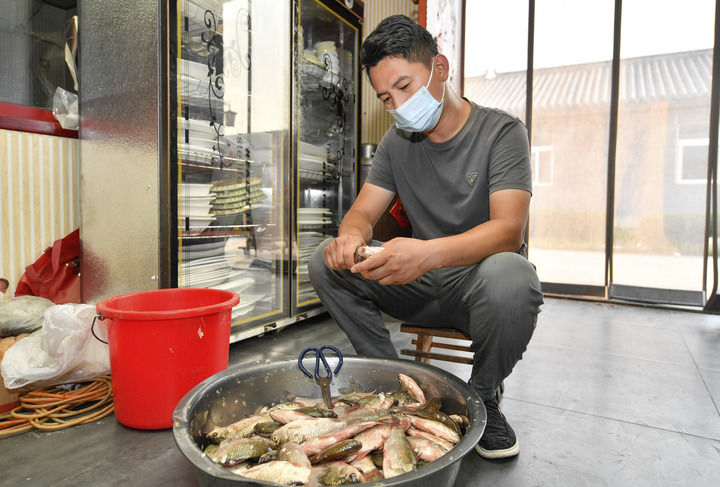 在天津市寶坻區(qū)黃莊鎮(zhèn)小辛碼頭村,李超清理村民在潮白河里捕到的河魚(yú)(2021年9月3日攝)。新華社記者孫凡越攝
