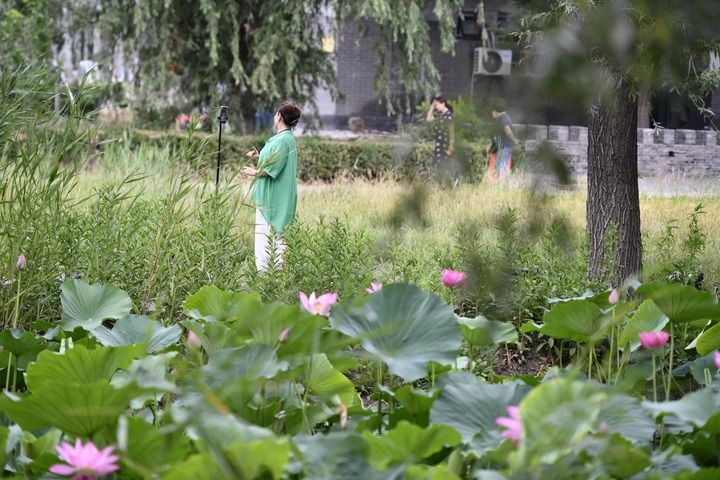 在天津市寶坻區(qū)黃莊鎮(zhèn)小辛碼頭村,游客在荷塘邊游玩(6月29日攝)。
