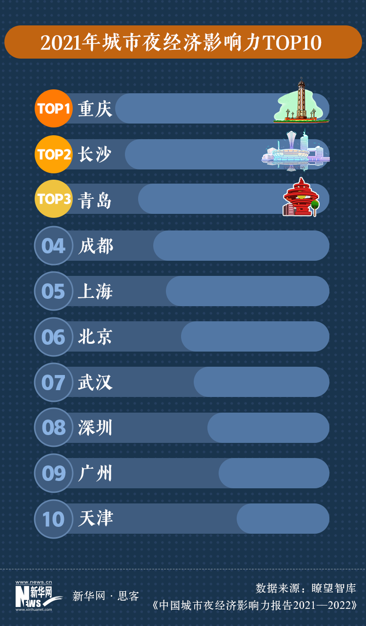 根據(jù)瞭望智庫(kù)發(fā)布的《中國(guó)城市“夜經(jīng)濟(jì)”影響力報(bào)告2021—2022》,重慶、長(zhǎng)沙、青島、成都、上海、北京、武漢、深圳、廣州和天津,位居2021年城市“夜經(jīng)濟(jì)”影響力前10名。同時(shí),長(zhǎng)沙天心區(qū)、北京朝陽(yáng)區(qū)、重慶渝中區(qū)、江北區(qū)和永川區(qū),青島西海岸新區(qū)、上海靜安區(qū)等20個(gè)區(qū)縣,位居2021年“夜經(jīng)濟(jì)”影響力區(qū)縣20強(qiáng)。